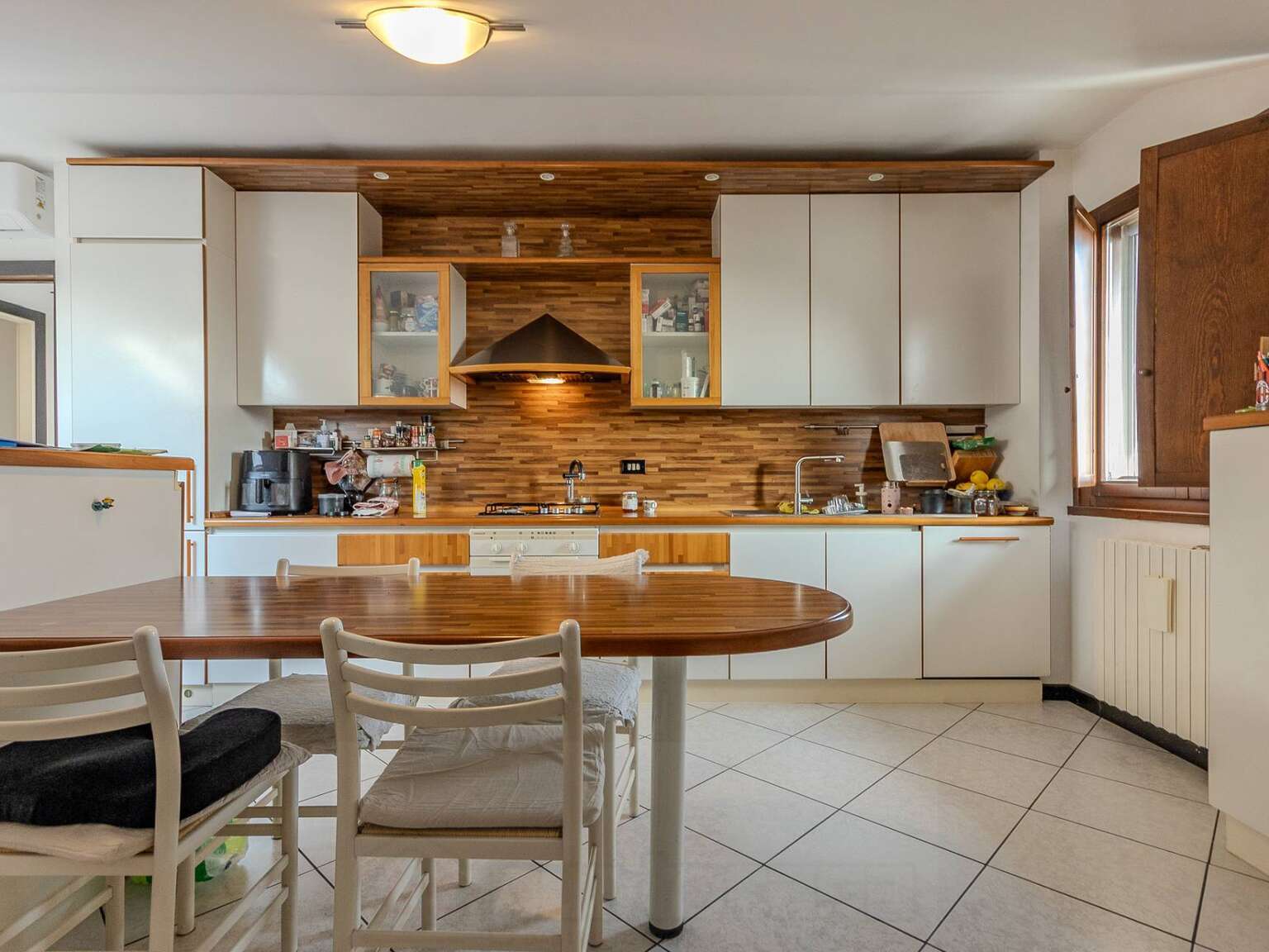 La porta d'ingresso si apre sul soggiorno luminosissimo ed accogliente che si sviluppa in lunghezza fino alla zona cottura che una armadiatura la rende ben separata dal resto. Un arredo pensato per la mansarda permette di utilizzare tutta la superficie dell'appartamento di oltre mq 90!