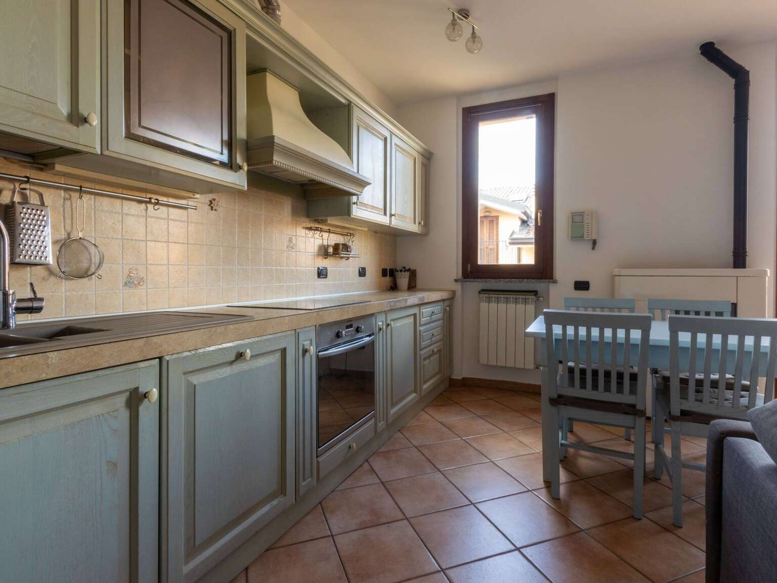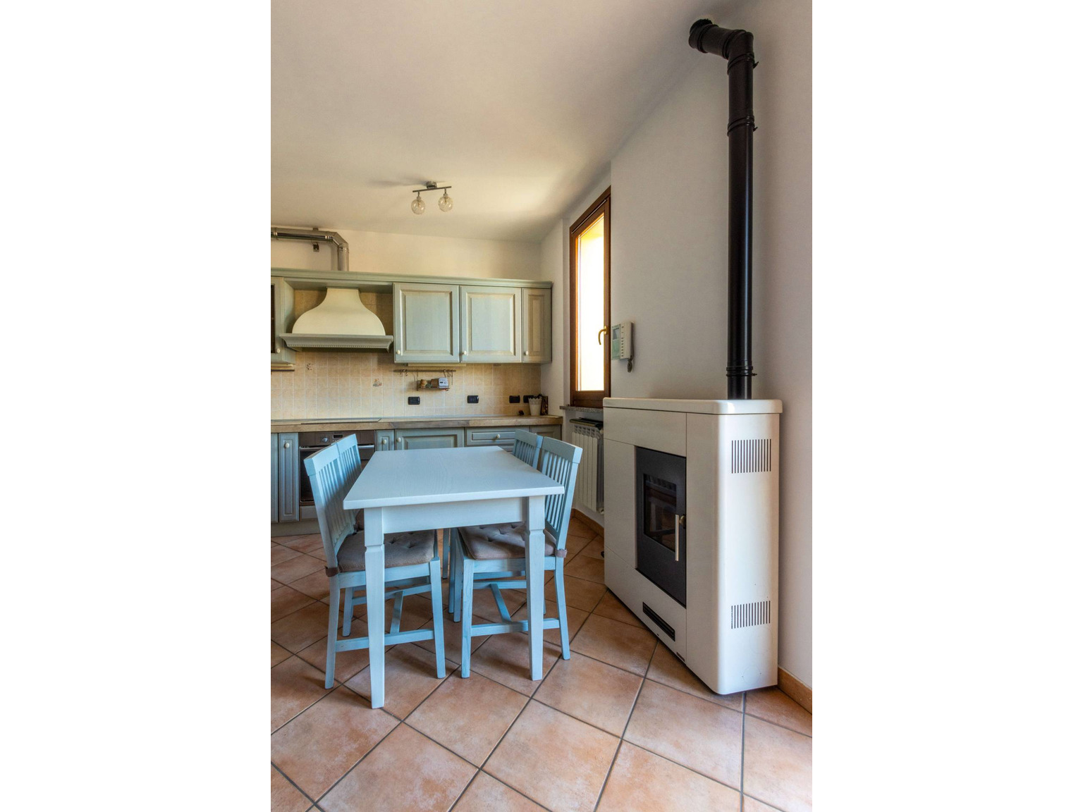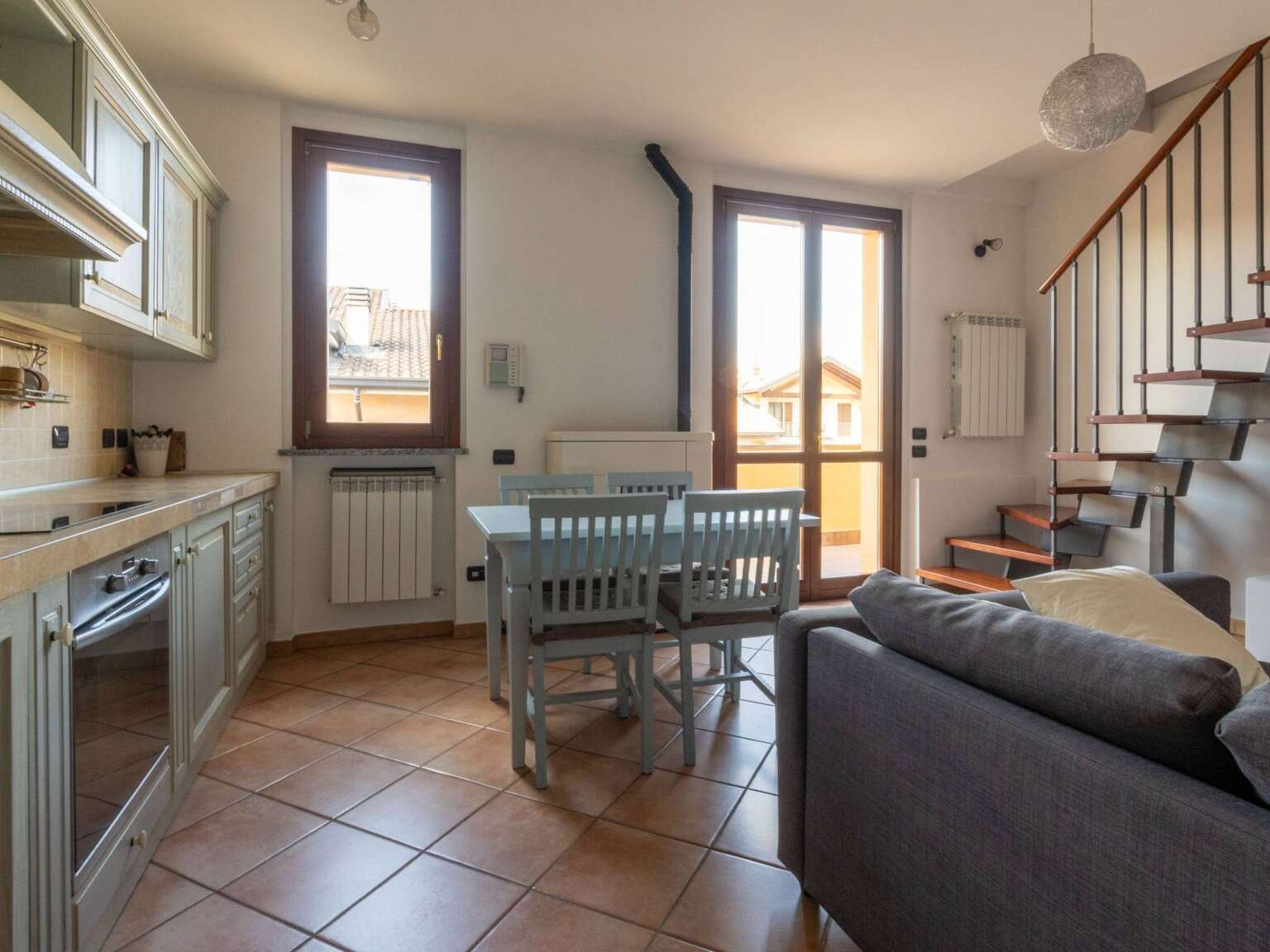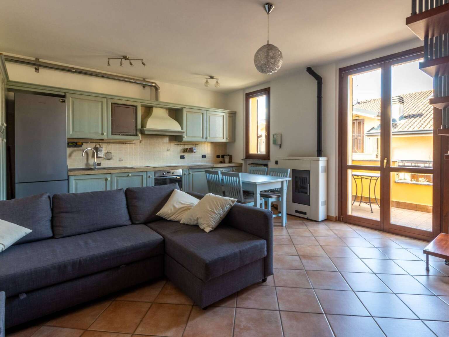 L'ingresso si apre sulla zona giorno con cucina a vista, un ambiente armonioso e ben organizzato, valorizzato dalla presenza di una stufa a pellet e dall'accesso diretto al primo terrazzo di 12 mq, uno spazio esterno piacevolmente fruibile. Sullo stesso livello, un disimpegno arredato su misura conduce al primo bagno finestrato con doccia.